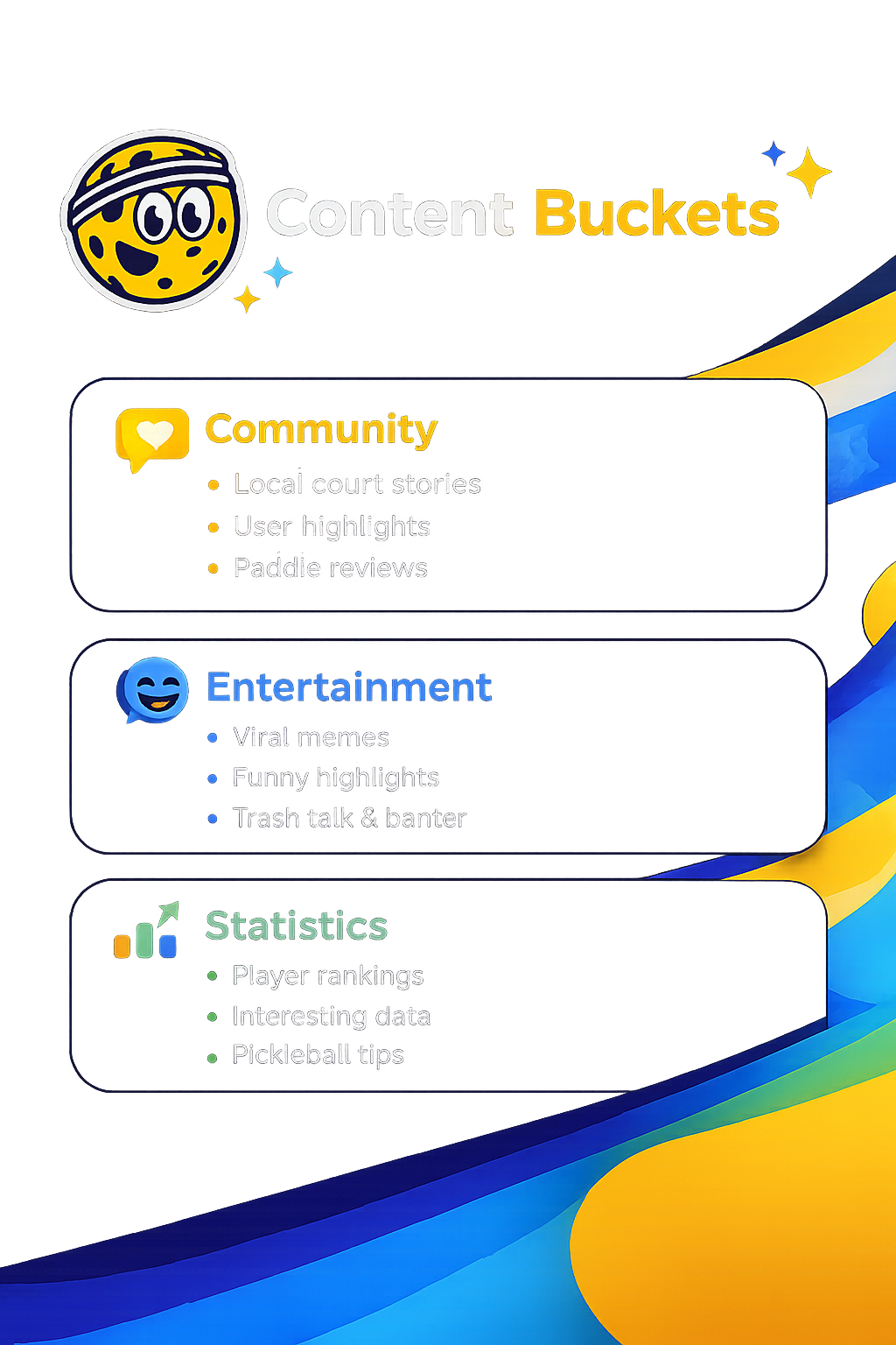 A structured content bucket system categorizing repeatable high-performing formats: stat cards, bracket hype, UGC reposts, memes, tips carousels. Includes a tracking framework to monitor performance by category and optimize what's working.